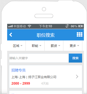 无需下载,不占手机空间,超省流量,没有机型的限制,有触屏手机就能上网找工作机会不再稍纵即逝,它已在你轻盈的指尖上